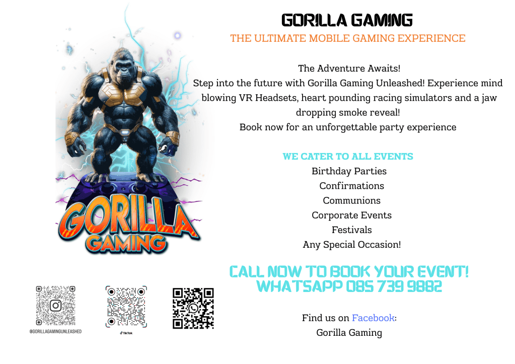 Step into the future with Gorilla Gaming Unleashed! Experience mind-blowing VR headsets, heart pounding racing stimulators, and a jaw dropping smoke reveal that will amaze your kids!